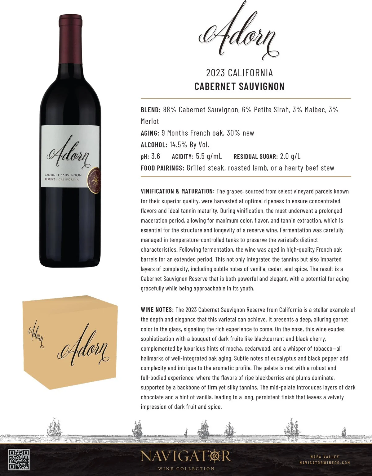 Adorn Wines offers a modern take on California classics, sourcing fruit from some of the state’s most acclaimed regions. Featuring varietals like Cabernet Sauvignon, Pinot Noir, and Chardonnay, Adorn is crafted to balance vibrant fruit—think cherry, blue fruits, and red berries—with layers of aromatic spice, floral undertones, and a soft, fresh finish. Each bottle is made with meticulous attention to detail, designed for easy enjoyment and everyday elegance, giving wine lovers a bright, expressive taste of California’s diverse terroir.