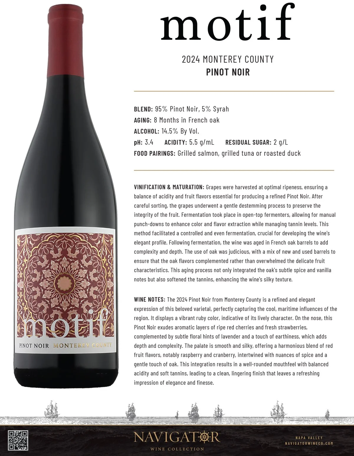 Each bottle is crafted with meticulous attention to detail, expressing ripe fruit, vibrant acidity, and balanced structure. By championing careful vineyard selection and thoughtful winemaking, Motif invites wine enthusiasts to explore the elegance and expressive flavors that have made California wines world-renowned.